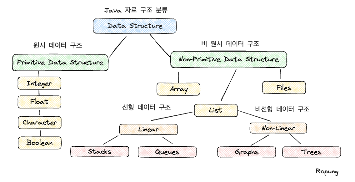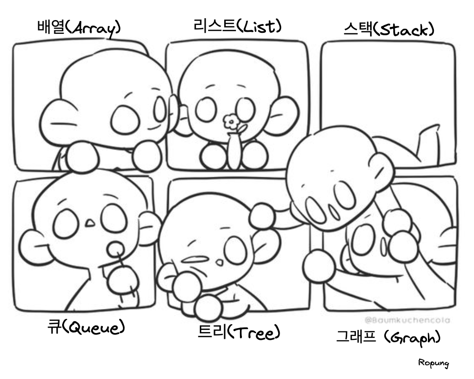 이제부터 다룰 자료구조 중 (어레이, 리스트, 스택, 큐, 트리, 그래프) 는 프로그래밍 언어에 독립적인 자료구조로써 프로그래밍에서 자주 사용되는 여러 가지 자료구조 중 일부입니다. 이러한 자료구조는 언어마다 조금씩 차이가 있을 수 있습니다.