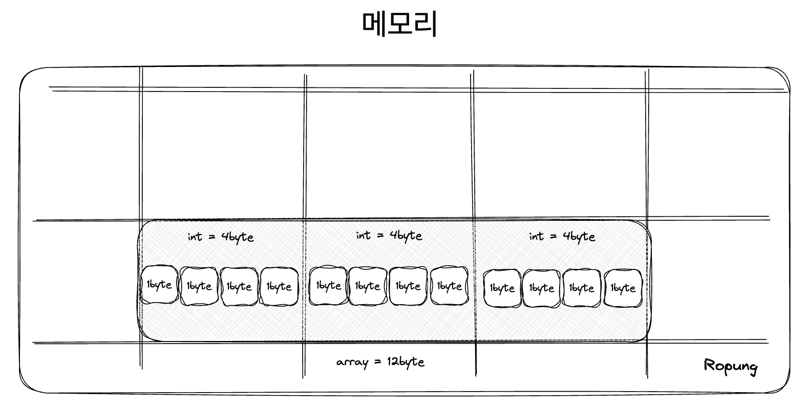 크기가 3인 int형(4byte)이므로, array 배열의 메모리는 총 12byte의 메모리 크기를 차지하게 됩니다.현대는 메모리가 풍족한 시대라서 임베디드 시스템이나 모바일 기기와 같은 제한된 리소스를 가진 환경 외 메모리를 개발자가 직접 다루는 일은 잘 없다고 봐도 무방하지만, 이러한 기본적인 원리, 구조 정도는 알고있는 것이 차후 훌륭한 개발자로 성장하는데 도움이 될 것이라 생각합니다.